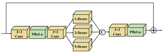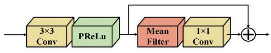 The presence of noise can affect the extraction of image features, so it is crucial to effectively suppress unnecessary noise before feature extraction. The structure of the FDB is shown in Figure 4. The FDB module first goes through a convolutional layer and a PReLu non-linear activation function. Then, it utilizes a mean filter as the primary denoising operation. Finally, the denoising process is encapsulated using a convolution and skip connections. Since some pixels in SAR images have high values and are prone to speckle noise, median filters may overlook pixels with higher values. In contrast, a mean filter can remove noise while smoothing details [34]. In addition, the mean filter algorithm is simple, computationally efficient, and does not introduce any parameters.