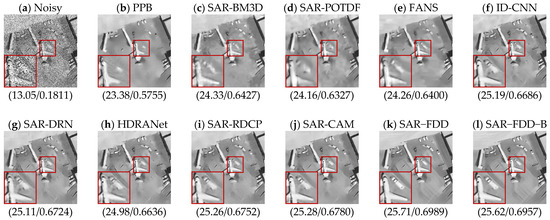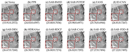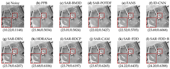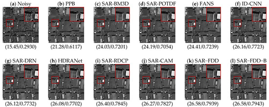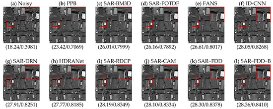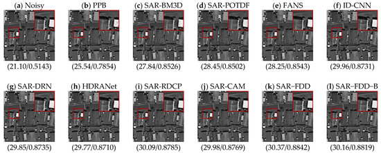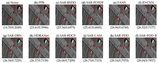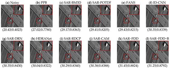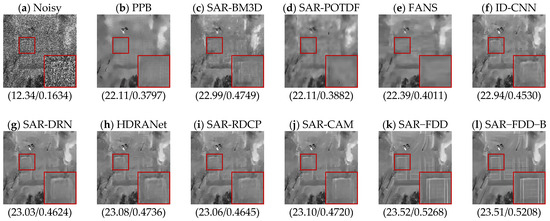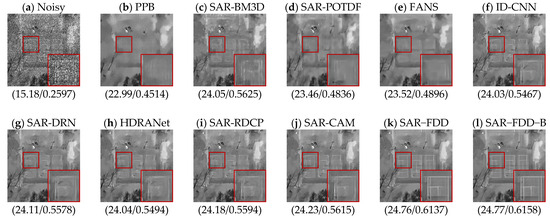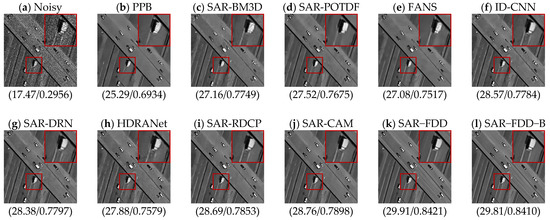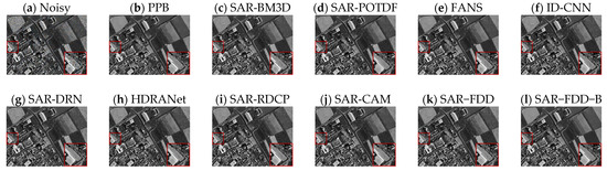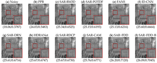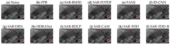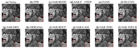 Figure 10, Figure 11 and Figure 12 show the noisy images and denoised images of the overpass with different values of L (L = 1, 2, 4). As shown in Figure 10b, Figure 11b, and Figure 12b, the PPB method applies over-smoothing to homogeneous areas of the images, resulting in ringing artifacts in the edge areas and significant degradation of the structural information. In Figure 10c,d and Figure 11c,d, both the SAR-BM3D and the SAR-POTDF methods still exhibit noise in the denoised images. Compared to the first three traditional methods, the FANS performs better but the restoration of the lane lines is incomplete. However, the convolutional neural network models achieve a better balance between image smoothing and edge feature preservation. In Figure 10f–j and Figure 11f–j, the ID-CNN, the SAR-DRN, the HDRANet, the SAR-RDCP, and the SAR-CAM fail to restore clear edge shapes of the vehicles and cause distortion and degradation of the lane lines. At L = 4, all methods achieve relatively complete recovery of the lane lines, but from the zoomed-in region, it can be observed that the SAR−FDD and the SAR−FDD−B perform the best in restoring the right lane line. Therefore, the proposed method in this study can effectively restore the structural shape of vehicles and the texture information of lane lines, yielding the best visual results.