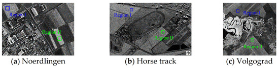 Due to the absence of clean SAR images in real life, we chose the UC Merced Land-Use remote sensing image dataset [49] as the dataset in this paper. This dataset includes 21 categories of scene images such as buildings, forests, harbors, and highways. Each category has 100 images, totaling 2100 images, with a size of 256 × 256 pixels for each image. The images were manually extracted from large images from the USGS National Map Urban Area Imagery collection for various urban areas around the country. The pixel resolution of this public domain imagery is 1 foot. To train the proposed network, 50 images were selected randomly from each category of scenes in this dataset, with a total of 1050 clean training samples. Then, we segmented the training samples into 40 × 40 blocks with a stride of 15 and applied random rotations and flips to increase the diversity of the data. For training the model with known noise levels, we added multiplicative noise with an L of 1, 2, and 4 to the training sets to simulate SAR noisy images, which were used as inputs to the network. For the blind despeckling model, we randomly added speckle noise with an L of 1, 2, 4, 6, 8, and 10 to the training sets. This model only needs to be trained once to restore SAR noisy images with different noise levels. The test dataset was divided into simulated and real image parts. For the simulated dataset, 5 images were selected randomly from each category of scenes in the UC Merced Land-Use dataset, totaling 105 images, and noise with an L of 1, 2, and 4 was added to each image. It should be noted that the images in the test dataset are not included in the training dataset. For the real SAR image denoising test, we used three images: Noerdlingen, a horse track, and Volgograd [50].