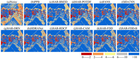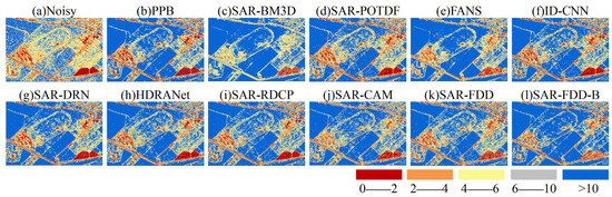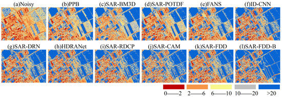 In order to further evaluate the despeckling effect of real images, inspired by reference [34], our study employs an unsupervised estimation method called “ENL map”. This method calculates the ENL value of a block of images and slides it until the entire image is covered. In homogeneous areas, the pixel values have less variation, resulting in a higher ENL value. Conversely, in edge regions, the pixel values differ more, leading to a lower ENL value. The ENL map reflects the despeckling effect in both homogeneous and edge areas. The results of the ENL maps for the three real test images are shown in Figure 23, Figure 24 and Figure 25. It is observed that the SAR-BM3D and the FANS methods have serious detail loss. The PPB method exhibits an obvious despeckling effect in homogeneous areas but introduces artifacts in edge regions, resulting in thick lines in the ENL map. The SAR-POTDF method has noise residue, which is particularly evident in Figure 25d. Regarding deep learning methods, the despeckling capability of the ID-CNN, the SAR-DRN, the HDRANet, and the SAR-RDCP in homogeneous areas needs to be improved. The SAR-CAM method shows a strong despeckling ability but falls short in edge preservation compared to the proposed SAR−FDD−B. Regarding the two proposed methods in this study, the edge feature preservation of SAR−FDD is sufficient, but there is more noise present. So, when it comes to removing noise from real noisy SAR images, the SAR−FDD−B method achieved excellent results in speckle suppression and edge preservation.