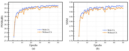 Average PSNR and SSIM of model with CA and without CA in the test datasets. (a) PSNR. (b) SSIM.