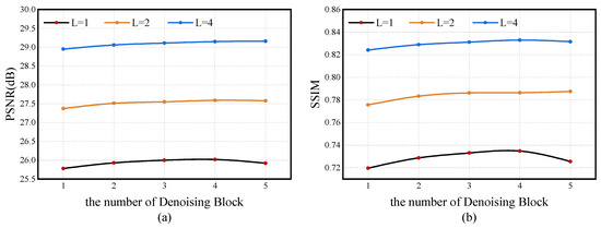 In Figure 1, the denoising block plays a key role. The number of denoising blocks used in this study is determined based on the experimental results shown in Figure 27. It is observed that, when the number of denoising blocks is less than 5, both the PSNR and SSIM values increase as the number of denoising blocks increases. However, when the number of denoising blocks reaches 5, the gains in PSNR and SSIM are not significant or even tend to decrease. Therefore, considering the computational complexity and denoising performance, this study selects 4 as the number of denoising blocks.