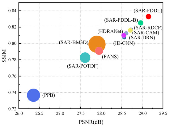 Figure 28 presents the comparison of various algorithms in terms of denoising performance and runtime. The horizontal axis represents the values of the evaluation metric PSNR, while the vertical axis represents the values of SSIM at L = 4. The size of the circles indicates the time used to test a single image, with larger circles indicating longer processing times. The SAR-BM3D takes the longest time, so it is likely to be limited in practical applications. The FANS algorithm shows comparable denoising performance to the SAR-BM3D but the time is greatly shortened. From Figure 28, it is evident that deep learning methods have significant advantages over traditional methods in terms of denoising performance and runtime, particularly the method proposed in this paper exhibits an outstanding denoising performance. Although our method may not have the shortest runtime, with the rapid development of computers runtime is no longer a major concern. The parameter quantities of eight deep learning methods are shown in Table 4. The proposed models in this paper have a lower parameter quantity compared to the SAR-CAM, and achieve better despeckling performance than it.