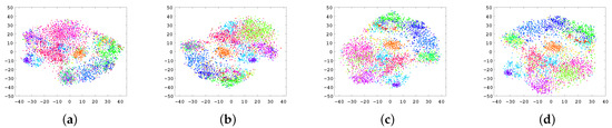 t-SNE visualizations on Scene dataset, where different colors represent different categories: (a) 3 epoch (Acc = 0.369), (b) 6 epoch (Acc = 0.592), (c) 9 epoch (Acc = 0.836), (d) 12 epoch (Acc = 0.909).