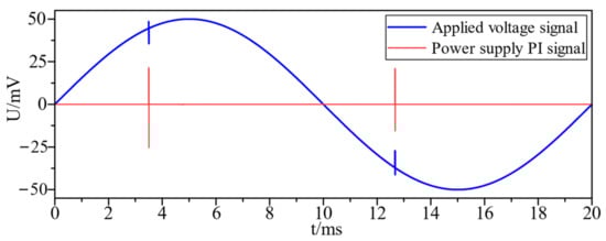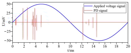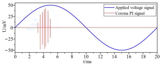 The above-mentioned signals were recorded in their time-domain waveforms, with each signal sample comprising no less than 50 groups, ensuring sufficient data for subsequent PI characterization. The structural schematic of the test platform is illustrated in Figure 2, while Figure 3, Figure 4 and Figure 5 display the PD, the corona PI, and the power supply PI signals obtained from these experiments. In Figure 3, Figure 4 and Figure 5 the blue line represents the applied voltage level, and the red line represents the discharge signal collected by the high-frequency oscilloscope.