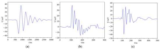 A further analysis of waveform parameters of individual time-domain pulse signals revealed distinct characteristics. As shown in Figure 6, the PD signals typically have a single-wave oscillation period of about 1500–3000 ns and a width of around 200 ns, exhibiting good attenuation and upper–lower symmetry. The external corona PI signal shows an oscillation period of approximately 600–1000 ns, a single oscillation width of about 50 ns, and poorer waveform symmetry. The power supply PI signal displays an oscillation period of about 300–600 ns, along with a single oscillation width of around 20 ns, and is concentrated in the positive amplitude region.