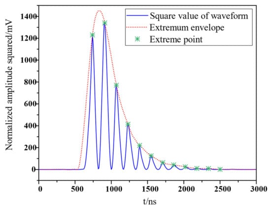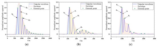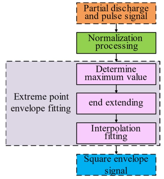 The extracted signal undergoes envelope processing to derive waveform parameter features. This study employed the square envelope method based on extremum points, which involves interpolating and fitting the signal envelope line using the pulse waveform’s maximum points. The process squares the signal voltage value to yield a unipolar waveform, aiding in the asymmetry analysis of PD and PI signals. The methodology comprises the following steps: