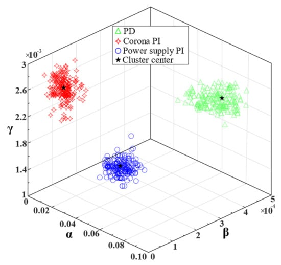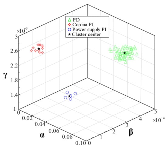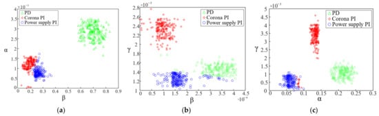 Using these characteristic parameters, the distributions of , , and can be obtained, as shown in Figure 10. In these distribution plots, it becomes evident that the two-dimensional distributions of the eigenvalues self-aggregate into three distinct categories. This observation suggests that the extracted characteristic parameters effectively classify the three pulse signals. Despite some overlap in the distributions of these pulses, the differences between them are more pronounced. Consequently, the envelope signal rise time percentage , left–right symmetry , and pulse waveform upper–lower symmetry were identified as the feature parameters for fuzzy clustering. Selecting these parameters aided in effectively separating the PD signal from the two PI signals.