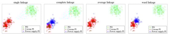 From Figure 12, it is observed that both single and average linkages tend to categorize the power supply PI signal almost entirely as the corona PI signal. A similar trend is noted with complete linkage, whereas ward linkage accurately identifies the three pulse signals. Table 1 further reveals that the AMI and FMI for the ward linkage are approximately 0.9, significantly higher than the other three methods. Additionally, the DBI is minimized, and the computation time is relatively short. Consequently, ward linkage was selected for constructing the hierarchical clustering. The results, depicted in Figure 13, demonstrate that various types of pulse signals cluster closely around their respective centers, with clear distinctions between different categories. This outcome suggests that the hierarchical clustering algorithm effectively identifies and separates PD and PI signals based on the extracted feature parameters (Figure 14). The clustering centers for the calculated PD and PI signals are detailed in Table 2.