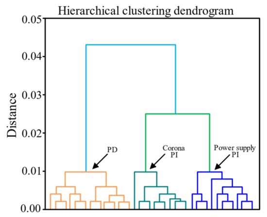 Artificial intelligence-based approaches have been increasingly utilized in electric apparatuses for control, diagnosis, prognosis, and signal classification and separation [29,30,31,32,33,34,35]. Among these, the machine learning-based approach has gained significant attention due to its advantages in accuracy, adaptability, and efficiency [29,30,31,32]. In this paper, a machine learning-based approach is proposed for classifying and separating PD and two typical PI signals. This method is based on the waveform parameter analysis combined with hierarchical clustering, specifically addressing two typical PI signals in the PD signal detection in the vehicle-mounted cable termination of high-speed EMUs. The PD and two typical PI signals were obtained from a cable termination test platform built in the laboratory. The waveform characteristics were analyzed, a single pulse envelope was processed, and feature parameters such as the rise time ratio, the left–right symmetry, and the upper–lower symmetry of the waveform were extracted. These parameters were then combined with the hierarchical clustering algorithm for signal classification. The obtained results verified the effectiveness of the extracted feature components, demonstrating good separability. This approach successfully classifies and separates PD and two typical PI signals in the vehicle-mounted cable termination of high-speed EMUs, with the advantages of requiring a small data volume and providing fast operational speed.