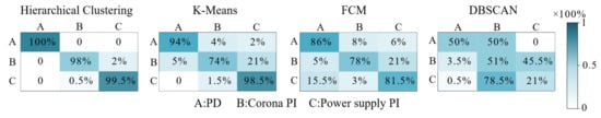 In order to select the most suitable clustering algorithm and compare the effectiveness of different clustering algorithms in studying pulse disturbances in partial discharges, this study included classical clustering algorithms from traditional approaches. These were K-means clustering, fuzzy c-means clustering (FCM), and density-based spatial clustering of applications with noise (DBSCAN). The confusion matrices of four methods, including hierarchical clustering, are illustrated in Figure 15, with the clustering quality analysis presented in Table 3.