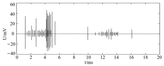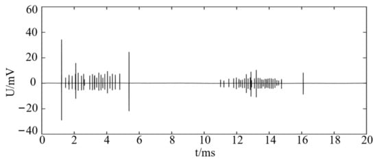 On the PD testing platform established in the laboratory, a mixed signal comprising PD, external corona, and power supply PI generated by multiple vehicle-mounted cable terminations within one power frequency cycle was captured, as shown in Figure 16. We extracted multiple α, β, and γ parameters from mixed pulse signals. We calculated the Euclidean distance between the pulse feature vector to be recognized and the standard cluster center, in order to effectively distinguish different types of pulse signals. This method uses standard clustering centers to cluster and separate mixed signals. For instance, selecting a mixed signal example as shown in Figure 16, the classification results include 10 corona PI signals and 5 power supply PI signals, while the remaining are PD signals. The clustering results are shown in Figure 17. Figure 18 shows the PD signal after PI signal separation. The separation process reduces the total amplitude and discharge phase of the PD signal in the first and third quadrants. This reduction effectively reduces the impact of PI signals on PD detection accuracy, thereby improving the reliability of PD methods in evaluating the insulation status of vehicle-mounted cable terminations.
