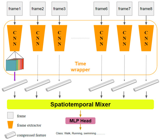 SCSM architecture. The feature extractor in the Time wrapper compresses frames into one-dimensional vectors and combines them to create a spatiotemporal feature. This feature is then passed via the Spatiotemporal Mixer to extract fusion information. The MLP Head classifies the output into corresponding actions.