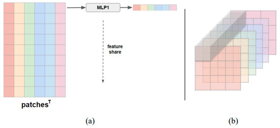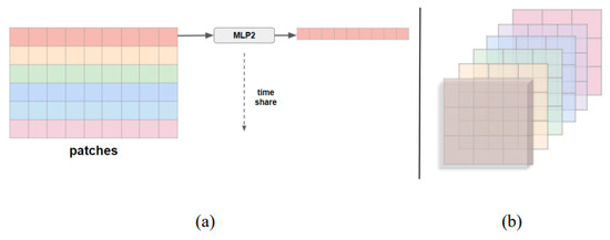 The second MLP block (MLP2) is the Temporal-Frame mixing. In this step, we extract features from different spatial positions at the same time. By sliding along the time axis, it learns the features of different spatial positions simultaneously, as shown in Figure 4a. This is equivalent to mixing features of different spatial locations within the same frame of a video, as shown in Figure 4b. The MLP2 is also designed with weight sharing, enabling communication and feature mixing between fused features from different frames. Calculations are performed on the rows of the patches, allowing weight sharing between rows. Through the MLP2 mapping from which maintains the dimensionality, different patches can communicate, and feature information can be mixed across different times.