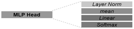 MLP head is composed of LayerNorm, mean, Linear, and Softmax in sequence.