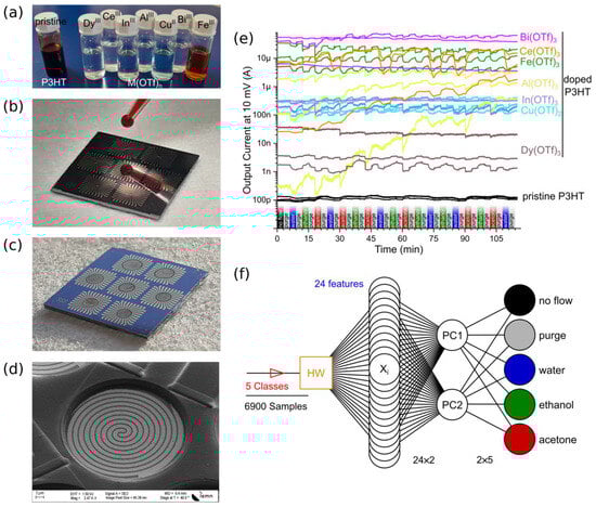 The hardware part of the classifier used in this study is composed of several clusters of conductimetric elements, with the metrological instrument that allows the outputting of the current i(t) for each sensing element polarized under a steady voltage bias in a chemically varying environment [28]. Each cluster of conductimetric elements was sensitized with a conducting material and a dopant (see Figure 1a–d). The dopants transduce to the conducting polymer, specifically the chemical interactions they have with environmentally present volatile molecules. When exposed to an air blow, dopants imprint on each polymer, coating the presence of volatile molecules in the carrier flow by the transience of the electric current that outputs under a steady voltage (see Figure 1e). The imprint for each volatile molecule on each sensing element is specific to the doping element [28].