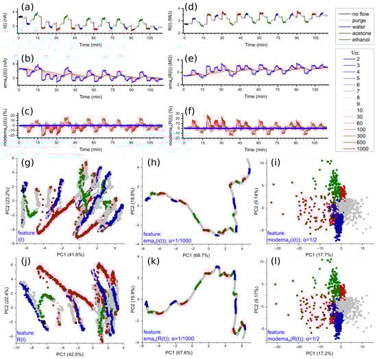 As an inverse of each other, resistances and admittances are not linearly correlated. Thus, as a linear classifier, a PCA based on one will differ from a PCA based on the other. Therefore, the ema-referenced feature study was performed in parallel with the resistance R(t) (in MΩ) and the current i(t) (in nA) for each sensing element as raw data vectors X(t) (see Figure 2). Figure 2a,d display the typical response of a sensing element without significant drift. In Figure 2b,e, the ema referencing behaves as a filter that reduces the signal noise for low 1/α− values. For values of 1/α− typically above 30, the filtering is such that the emaα(X(t)) presents a noticeable temporal delay compared to the signal X(t), both for the resistance and the current.