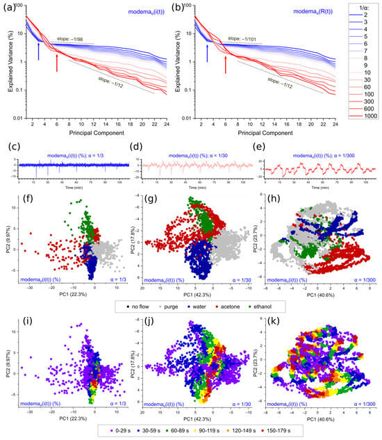 Data separation of the modema() information descriptors depending on the attenuation coefficient α. (a,b) Scree plots for modemaα(i(t)) and modemaα(R(t)) with different values of α. (c–k) First two component scores of the principal component analysis on the modemaα(i(t)) datasets for 1/α = 3 (c,f,k), 30 (d,g,j) and 300 (e,h,k). (c–e) A single raw current data trace from Figure 2b for different values of 1/α = 3 (c), 30 (d) and 300 (e). (f–k) (PC1;PC2) planes for the full modemaα(i(t)) dataset for 1/α = 3 (f,i), 30 (g,j) and 300 (h,k), labeled with the five environmental classes (f,g,h) or with six classes of acquisition times after exposure starting at t0 (i,j,k).