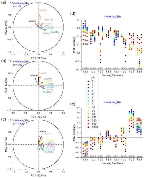Principal component scores show various organizations on the (PC1;PC2) projection depending on the attenuation coefficient α (see Figure 3f–k). By looking at the gradual decrease in the attenuation coefficient α, it can be observed that data separability by the nature of the exposed environment tends to increase (comparison between α = 1/3 and 1/30 in Figure 3f,g), before the score clusters start collapsing in (PC1;PC2) (comparison between α = 1/30 and 1/300 in Figure 3g,h). This indicates that the emaα(i(t)) shall feature a floating reference point that is filtered from the inherent signal noise but not filtered from the whole activity of the signal. Such a characteristic presents similarities of both resistance modulation (R/R0 − 1) and drift resistance (Ṙ/R) as information descriptors, which gather different aspects of the signal’s physics [30]. By the structure of the feature, both modemaα(i(t)) and R/R0 normalize a value recorded at a given time to a buffered reference that changes all along the acquisition. However, both modemaα(i(t)) and Ṙ/R are referenced to a local value all along the acquisition. modemaα(X(t)) can represent a generic compromise to reference data without the intervention of an external user (unlike setting R/R0 − 1), with a higher representation of the steady effect of the environment on a material (unlike Ṙ/R). When looking at the temporality of the data, it appears that the most separable feature samples are generically originating from the most dynamical raw data ones (as property shared with Ṙ/R) [30]. Particularly for the cases of a high attenuation coefficient α, data generated within the first 30 s after a new class exposure at t0 exhibit higher spreading on a (PC1;PC2) projection plane when compared to points recorded much later for α = 1/3 and 1/30 (see Figure 3i,j). In these cases, the emaα(i(t)) floating reference is very similar to the raw signal i(t). So, the modemaα(i(t)) is very noisy except when transient (see Figure 3c,d). For a lower attenuation coefficient α at 1/300, it is also noticed that PCA scores on (PC1;PC2) are not organized by acquisition times anymore, as the emaα(i(t)) floating reference embeds less class-specific information and modemaα(i(t)) reflects more a drift-free relative current modulation (see Figure 3e,k). It is particularly interesting to observe that, despite the transduction mechanism being interpreted as a thermodynamic property [28,50], resistance modulation is not the main source of information that an unsupervised classifier such as the PCA exploits to sort output current-related data by the nature of the molecular environment that is exposed on the doped polymers. As the quality of the PCA clustering is sensitive to the attenuation coefficient α, it may be important to inspect the PC loadings for different α to observe whether the classifier universally uses the same selection of materials, independently from what physical properties they may contribute to the emaα(i(t)) floating reference (see Figure 4).