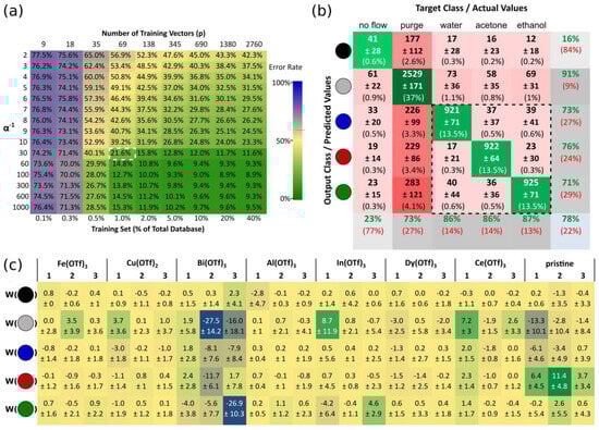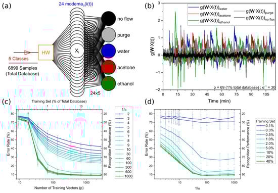 To quantify the performances of a classifier when recognizing molecular environments, the Moore–Penrose pseudo-inverse was used to supervise the training of the electronic nose in recognizing the five classes of environments by the use of modemaα(i(t)) as the 24-dimensional information descriptor. In this case, the recognition space is not dimensionally reduced to only two principal components, so the modemaα(i(t)) information is used in its entire complexity to recognize the feature vectors, whether they were recorded upon no flow, under purging or exposure of either a water, an acetone or an ethanol vapor blow (see Figure 5a). As in former studies [49], and similarly as in the case of the PCA classifier, all dynamical data generated during a complete acquisition are used in a classifier. Training and testing vectors are randomly picked from the 6899 available vectors to form two complementary databases (no validation database was used to optimize the attenuation coefficient α, as all the 15 α cases were generated in separated experiments as a variable of study). As a second variable of study, the size of the training dataset (related to the number of training vectors p) was studied to observe its impact on the classifier recognition performances at a given attenuation coefficient α. The classification threshold was set on the weighted g(W·X(t)) vectors (with modemaα(i(t)) as X(t)) optimized by pseudo-inversion after training, showing the different components of the five environments to express mostly at different periods of time during the acquisition (see Figure 5b).
