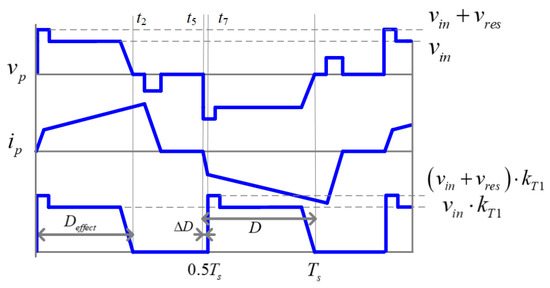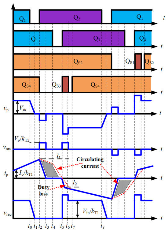 Duty cycle loss is the major problem of the conventional PSFB converter. It happens when ip cannot change immediately owing to Llk. Details of the duty cycle compensation in the proposed converter are given in Figure 5. The duty cycle loss is