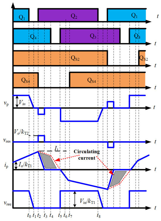 Stage 1 (Figure 4a, before t0): Before t0, Q1, and Q4 are on, T1 transfers power from the primary side to the secondary side and the load. QS2 and QS4 are also on, the secondary side of T2 free-wheels the primary current, and vres is zero.
