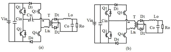 Compared with ZVS PSFB converters, zero-voltage and zero-current switching (ZVZCS) PSFB converters can avoid some inherent defects and thus have seen wide application in high-power fields [21,22,23,24]. In [23], the ripple voltage provided by a blocking capacitor is used to reset the primary current, and the reverse current is prevented by a two-diode series connecting to the lagging-leg switches. Then, a good soft-switching characteristic over a wide load range can be achieved in the lagging-leg switches. Furthermore, this circuit has minimum duty cycle loss as well as conduction loss. To better reset the primary current during the free-wheeling period, the circuit in [24] adds a clamping diode and a MOSFET behind the rectifier diodes. A controllable voltage source is used in [25] to help quickly reset the primary current, which exceeds the power rating limitation of the conventional ZVZCS converter. In [26], a wide load range of soft-switching is realized in a new topology, combining a half-bridge LLC and PSFB. Furthermore, this converter also features minimum duty cycle loss.
