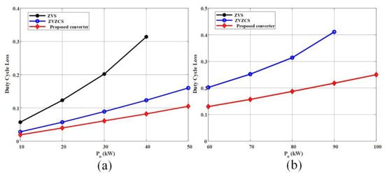 Comparison of duty cycle loss: (a) duty cycle loss of ZVS, ZVZCS, and proposed converter (Po = 10 kW–50 kW); (b) duty cycle loss of ZVZCS and proposed converter (Po = 60 kW–100 kW).