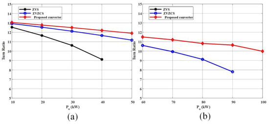 Variable turns ratio: (a) ZVS, ZVZCS, and the proposed converter (Po = 10 kW–50 kW); (b) ZVZCS and the proposed converter (Po = 60 kW–100 kW).