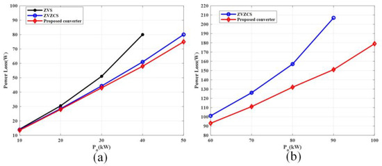 Comparison of conduction loss: (a) ZVS, ZVZCS, and the proposed converter (Po = 10 kW–50 kW); (b) ZVZCS and the proposed converter (Po = 60 kW–100 kW).