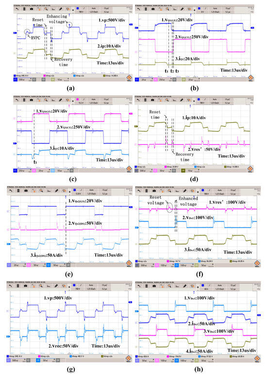 Experiments’ results: (a) vp and ip; (b) vQ1(GE), vQ1(CE), and iQ1; (c) vQ3(GE), vQ3(CE), and iQ3; (d) ip and vres’; (e) vres, vDo1 and iDo1, and iQs2; (f) vDo1, iDo1, vDo2, and iDo2; (g) vp and vDo1; (h) vp and vDo1 in normal mode.