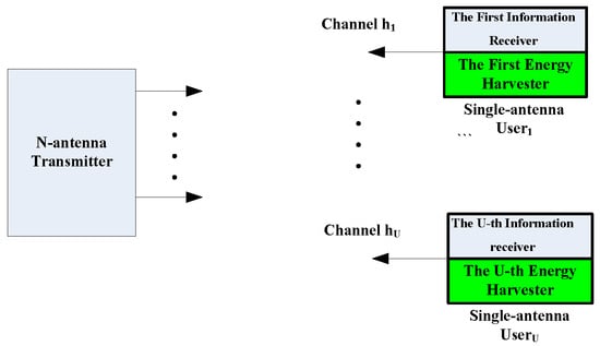 We consider an MSM-SWIPT system with an N-antenna base station and U single-antenna users, which is illustrated by Figure 1. Over L time slots, the base station’s N antennas transmit an  matrix signal  carrying K-bits of information, where the cardinality of  is equal to . Then, through the channel vectors , the  signal collected by user u within L time slots, , can be represented by
