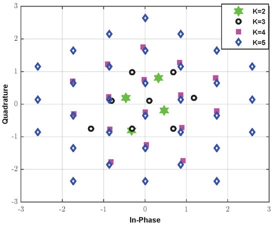 - Foschini, G.J.; Gitlin, R.; Weinstein, S. Optimization of Two-Dimensional Signal Constellations in the Presence of Gaussian Noise. IEEE Trans. Commun. 1974, 22, 28–38. [Google Scholar] [CrossRef]