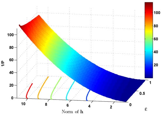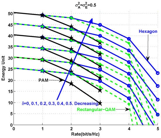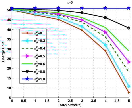 In this example, we let  since , where  is the Q-function for . Therefore,  can assure a pair-wise error probability that is smaller than . For the purpose of exposition, we assume that  (following []) and . The transmitted power is equal to . The FREUT is illustrated in Figure 4 and Figure 5. From these simulations, we can see that the rate–energy–uncertainty is closely related to the corresponding constellation in time dimensions. From Figure 4, we can see that if a constellation in the time dimension has higher energy efficiency, then for a given EH level τ, a larger transmission rate can be guaranteed under a QoS requirement. In addition, as illustrated by Figure 5, we can see that the EH processing noise  dominantly influences the FREUT compared with the antenna noise . Interestingly, when  and , the FREUT region is a “box”; say, the optimal performance of IR and EH can be achieved simultaneously for an ideal receiver antenna. Therefore, this example suggests that the FREUT is upper-bounded and lower-bounded by that with  and , respectively.