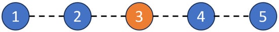 Graph representation for an undirected line graph with five agents, where the third agent is the leader.