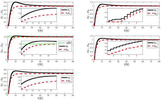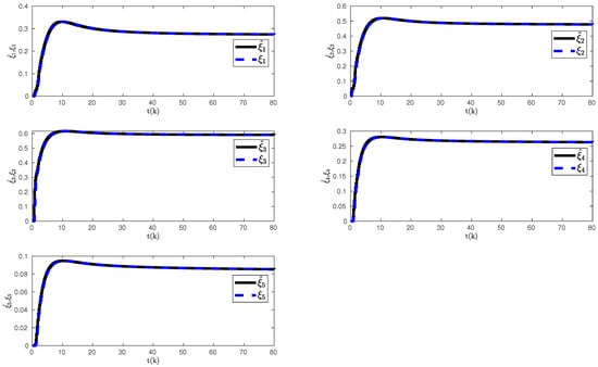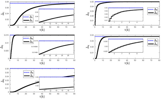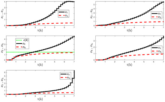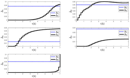 We set the control parameter to that satisfies rule defined in Section 2, where modified degree values are calculated as , , , , and . Here, the satisfies the rule and ensures that the eigenvalues of “” remains within the unit circle with , , , , and . Finally, all the initial conditions are set to zero.