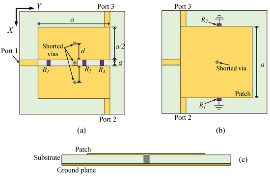Figure 1 gives the geometries of the fundamental models for both dual-band FPD and wideband FPD. The square patch resonators are connected to the ports by 50 microstrip lines. For the dual-band FPD model shown in Figure 1a, a shorted via is added at the center of the patch along with another pair of shorted vias located at the middle of the patch. In addition, a total of three lumped resistors (, , ) are placed in the middle gap for isolation between Port 2 and Port 3. In the fundamental model, we mainly focus on the passband of the device because it is mainly dependent on the characteristics of the fundamental model, while the TZs and isolation can be later optimized. Hence, the resistors are not considered in the following results since they do not have an effect on the passband while only Port 1 is excited.