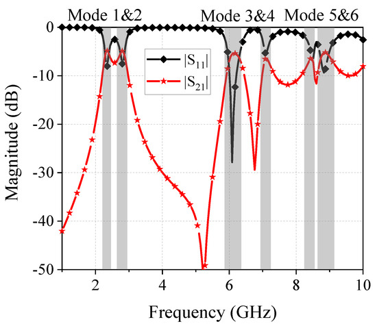 For a demonstration, the parameters of this model are given as follows: a = 28 mm, g = 0.9 mm, d = 9.1 mm, the substrate is a Rogers 4003 with a thickness of 0.305 mm, and the diameter of the vias is 1.2 mm. The simulated S-parameters result of this model is presented in Figure 2, where it can be learned that a total of six modes are excited from 1 GHz to 10 GHz. To give a further analysis, Figure 3 depicts the strength of the electric fields of these modes on the patch resonator (the microstrip feeding lines are not shown in the figure for simplicity). The theoretical E field distribution of a rectangular patch resonator can be computed by [29].