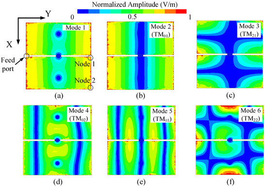 where is the strength coefficients of the TMmn mode, and L and W are the length and width of the patch. Using the above equation, certain modes of the patch resonator can be defined at the corresponding frequencies, except for mode 1, because mode 1 is generated with the aid of the shorting pins but not by the patch itself [24]. The simulated E fields shown in Figure 3 also indicate that the maximum field strength of all modes can be obtained either at the same side as the feeding port (marked as Node 1 in Figure 3a) or the diagonal location of the patch (Node 2). Hence, in order to obtain a low insertion loss of the power divider at both the lower and higher passband, the output ports (i.e., Port 2 and Port 3) must be placed near these two nodes. The locations of Port 2 and Port 3 are finally selected to be at Node 2 (and its symmetrical one) to avoid the mutual coupling between the two microstrip lines. From the transmission performance shown in Figure 2, it can be also learned that there are two modes suitable for a low-frequency passband (Mode 1 and 2) and the other four modes are more suitable to form a wider passband at the higher frequency. Therefore, this fundamental has the potential to be optimized as a dual-band filtering power divider by further modifying the shape of the patch resonator.