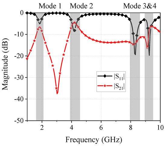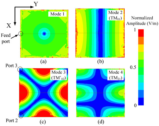 On the other hand, the fundamental model for a wideband FPD is simpler as illustrated in Figure 2b. Its simulated S-parameters result is presented in Figure 4. The substrate used in this model is the same as the dual-band FPD model above. For the wideband FPD model, only one shorted via is added at the center of the patch, and two lumped resistors (, ) with the same resistance are attached to the edge of the patch for good isolation. Note that the resistors are still not considered, and their values are infinite in the following simulated results since they have little effect on the modes’ frequency and patterns. In order to generate a fundamental mode (TM01) of the patch resonator at around 4.3 GHz, the size length of the patch is set to 19 mm with the same substrate as the previous model. A total of four modes are excited across 1 to 10 GHz, according to the result shown in Figure 4. Similarly, one can obtain the electric fields of these modes as shown in Figure 5. The TM′02 mode is generated because the existence of the shorted via disturbs the original TM02 mode of the patch resonator. For a single-band operation, the suppression of the higher mode is desired to obtain a better out-of-band suppression performance. Thus, Port 2 and Port 3 are placed at locations where the TM′02 mode has its minimum field strength.