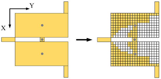 The fundamental models designed above lay the groundwork for the corresponding optimization problems. In this section, a detailed design of the optimization process is provided to effectively solve these problems. Firstly, we need to define the independent variables in the optimization problem, which also are the parameters that need to be optimized. In the specific problems of this design, the parameters are the shape of the patch resonator, the position of the resistors, and the positions of the shorted via for the dual-band FPD. Therefore, half of the patch resonator is pixelated into a 10 × 20 binary matrix, and due to the symmetry of the patch, these values can completely represent the whole patch resonator during the optimization. This procedure is illustrated in Figure 6. Note that for both dual-band and wideband FPD, the position of the center vias always remains unchanged during the whole optimization. As a result, there are 200 discrete variables for the patch resonator, 5 continuous variables for the locations of the resistors, and shorted vias (i.e., the value of d shown in Figure 1a) when solving the dual-band FPD problem. And for the wideband FPD problem, only two continuous variables are needed for the locations of the resistors.