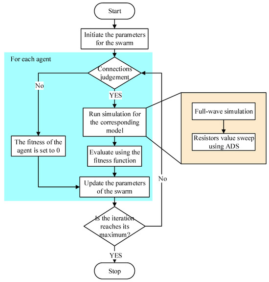 To cut down the number of variables and thus obtain higher efficiency, a coarse-to-fine optimization is applied here. The optimization process is divided into two stages: coarse optimization and fine optimization. In the coarse optimization, the patch resonator is pixelated into a 10 × 10 binary matrix instead of a 10 × 20 one, and each pixel is a rectangle with a side length ratio of 1:2, while the fine optimization divides the patch resonator further into a 10 × 20 binary matrix based on the result of the coarse optimization. At the beginning of the fine optimization, the locations of the population are imported from the individual best solution of each agent obtained in the coarse optimization. In this way, a transition from coarse optimization to fine optimization is achieved. The two stages of the optimizations share the same procedure shown in Figure 6 but use different parameters of the swarm and fitness functions.