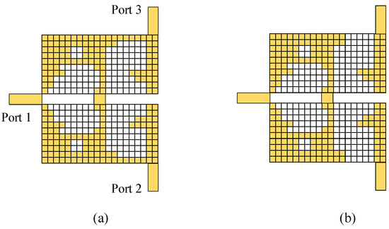 Before the simulation is set to obtain the result for the corresponding agent, an extra connection judgment is required here. The purpose of this procedure is to check the valid connection between the ports to prevent meaningless simulations for those models without direct connections between the ports. Figure 8 illustrates this problem with an example of a valid patch and an invalid patch, respectively. The main distinction between a valid patch and an invalid one is that the valid patch contains a direct path from Port 1 to Port 2 (or Port 3), while the invalid one does not. Hence, the transmission property of the invalid patch is bound to be poor, as the energy cannot reach the output port (i.e., Port 2 or Port 3) through the patch. Running simulations for such models is senseless since the results of them are already known. Consequently, a depth-first search (DFS) algorithm is utilized here to check the connection of the patch shape. If DFS fails to find a valid patch from Port 1 to Port 2 (or Port 3) according to the location of the agent, then the fitness of this agent is set to the worst case, which is 0 in this optimization process. This procedure can decrease the time for an iteration, especially at the beginning of the coarse optimization, where a large number of invalid patch models may be generated due to the blind searching of the initial swarm.