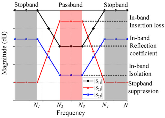 Hence, the fitness function in this problem can be divided into three parts: the fitness of the in-band insertion loss , the fitness of the in-band isolation , and the fitness of the stopband suppression . The in-band reflection coefficient can be ignored here since a good insertion loss already implies a low reflection coefficient of the device. For the coarse optimization process, the definitions of , , and are given by: