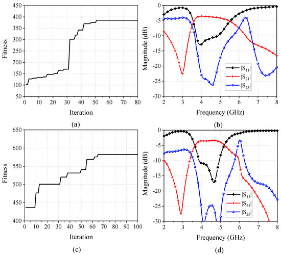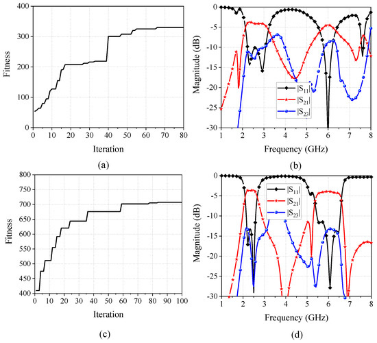 Figure 10 gives the run results for the dual-band FPD optimization, including the fitness curves and the simulated results of the best model. The maximum iterations are 80 and 100, respectively, for the coarse optimization and the fine optimization. The fitness of the best model obtained in the coarse optimization is 330.6 after 66 iterations of the algorithm as shown in Figure 10a. Note that an upsurge can be observed after the 39th iteration because the agents have found the solution whose weight for the isolation becomes non-zero, which greatly increases the best fitness of the swarm. Figure 10b demonstrates the simulated S-parameters of the best solution in the coarse optimization. It can be learned from the figure that despite the insertion loss being high, a dual-band operation is achieved, and a roll-off can be also observed outside the passband. Based on the individual best location found in the coarse optimization, a fine optimization is then utilized to further divide the patch resonator to obtain a better result of the FPD. Figure 10c shows the fitness curve of the fine optimization. Owing to the imported initial locations, the agents do not have to search blindly at the beginning of the process, which results in higher fitness at the first iteration. The simulated results of the best solution found in the fine optimization are depicted in Figure 10d. Compared to the results shown in Figure 10b, the ultimate model has lower insertion loss, lower reflection coefficient, better selectivity, and better isolation. Hence, the final model found in this algorithm successfully realizes a dual function of filtering and power dividing at both 2.4 GHz and 6 GHz.