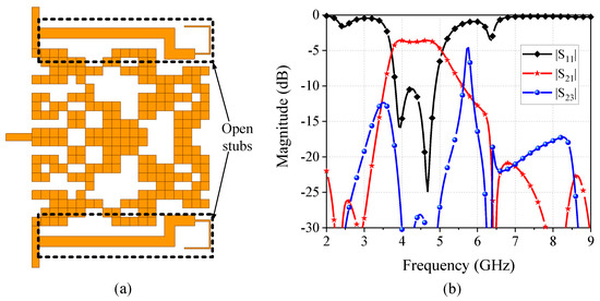 Similarly, the run results for the wideband FPD are also given in Figure 11. The desired operating frequency is set to 3.7 GHz to 5.1 GHz. The fitness curve given in Figure 11a shows that the algorithm converges at the 51st iteration, with a maximum fitness of 384.8. The fitness leaps from 170 to 302.5 at the 32nd iteration, indicating that a solution with good isolation was found as proved in the simulated results given by Figure 11b. However, the fine optimization on the wideband FPD model has a more limited effect compared to the dual-band FPD. From the fitness curve shown in Figure 11c, the algorithm converges at the 65th iteration with less improvement of the best fitness. While the ultimate model exhibits improved insertion loss and selectivity compared to the results achieved in the coarse optimization, it is noteworthy that the FPD has only two TZs, inducing a poor filtering function. To further enhance the filtering performance of the wideband FPD, a pair of open stubs is placed at the output ports to provide two extra TZs. The final wideband FPD with the open stubs along with its optimized results are shown in Figure 12. With the aid of the open stubs, a total of five TZs and an out-of-band suppression of −20 dB across 2 GHz to 9 GHz can be obtained.