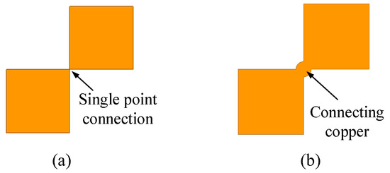 Connection of the diagonal pixels with (a) single-point connection. (b) Connecting copper.