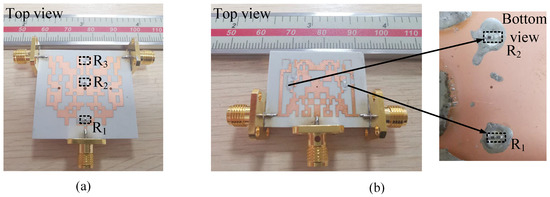 Fabricated prototype of (a) dual-band FPD with R1 = R2 = 45 Ohm, R3 = 85 Ohm. (b) Wideband FPD with R1 = R2 = 50 Ohm.