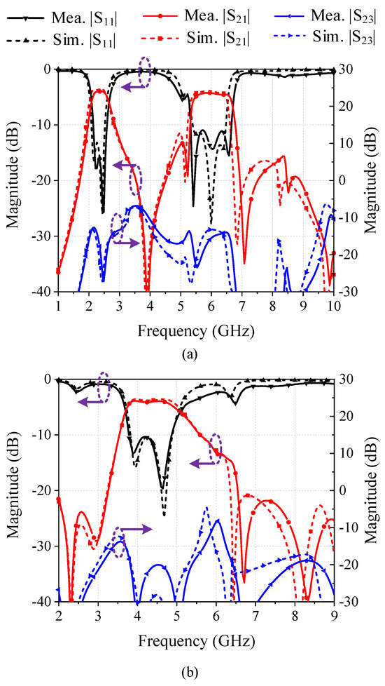 The measured results of the prototypes are demonstrated and compared with the simulated ones in Figure 15. It can be learned from the figure that all experimental results are in good agreement with the simulated results. For the dual-band FPD, the center operating frequencies are 2.4 GHz and 6 GHz, with a measured 3 dB bandwidth of 0.65 GHz and 1.25 GHz, respectively. The measured maximum insertion loss is 4.05 dB during the lower passband and 4.3 dB during the upper passband, which is about 0.3 dB lower than the simulated results. A total of 6 TZs can be observed across 1 GHz to 10 GHz, which enables high selectivity of the FPD.