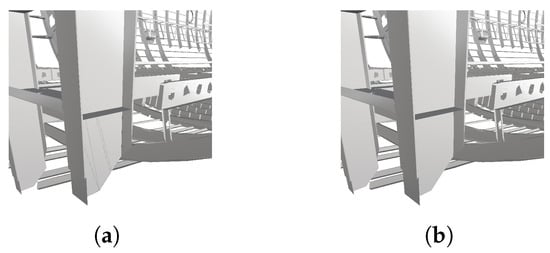 The figures below illustrate the flaws and the repair effect in the aircraft model. Figure 4 shows the gaps in the aircraft model due to problems such as the assembly of parts. Figure 5 shows repeated planes due to problems such as structural design or surface assembly. Figure 6 shows the holes present in the model aircraft. At the same time, the effects of gap, repeated plane, and hole repair are shown.